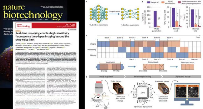 近日,清华大学自动化系、清华大学脑与认知科学研究院、清华-IDG/麦戈文脑科学研究院戴琼海院士,清华大学深圳国际研究生院王好谦课题组提出一套实时荧光成像去噪架构(DeepCAD-RT),将此前开发的基于自监督学习的智能图像去噪方法进行了深度的整合和优化,通过将模型预测过程融合到成像流程中,在双光子荧光显微镜上实现了实时的(30Hz)荧光成像去噪。借助此方法,在使用显微系统对生物样本进行荧光成像时,研究人员就能够实时地得到增强之后的图像,将成像所需的荧光光子的数目缩减10倍以上,实现了超越光子噪声极限的实时超灵敏荧光成像。该方法被应用于小鼠、斑马鱼、果蝇等多种模式动物的神经钙成像实验,观测范围涵盖细胞体、神经纤维、树突棘等多个尺度。此方法还被应用于观测免疫细胞在急性脑损伤之后的三维迁移过程,以及大脑皮层中胞外信使ATP(腺嘌呤核苷三磷酸)在损伤点位周围的发放过程,在国际上首次做到对ATP发放过程的长时程(1小时)三维(350×350×60 μm3)观测,并给出了关于发放位置、时间、发放点位的三维形状等量化特征的完整统计结论。